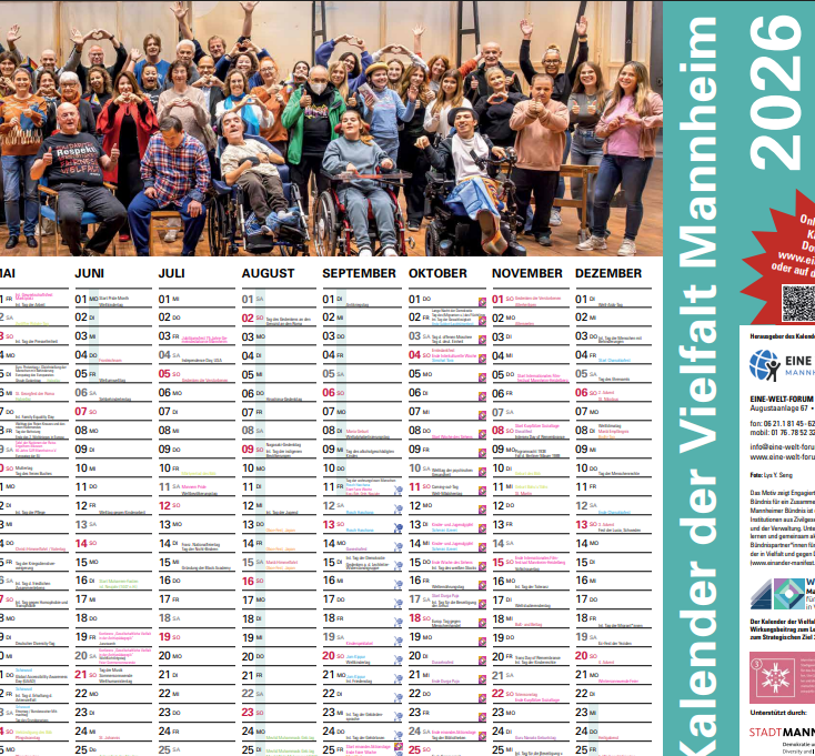 Der Kalender der Vielfalt Mannheim wird durch das Eine-Welt-Forum Mannheim e.V. in Kooperation mit der Stadt Mannheim, Koordinierungsstelle Mannheimer Bündnis herausgegeben. Gerne können Sie kostenfreie Print-Exemplare für Ihre Einrichtung bzw. für Ihre Netzwerke beim Eine-Welt-Forum bestellen: